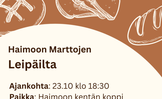 Haimoon Martan järjestävät Leipäillan torstaina 23.10. kentän kopilla! Illan teemana ovat rennon yhdessäolon lisäksi luovat leivänpäälliset ja tarjolla on teemaan sopivaa maisteltavaa. Tervetuloa!