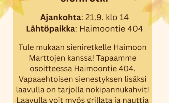 Muokkaus 14.9: Haimoon Marttojen sieniretki päätettiin siirtää viikolla eteenpäin uudelle ajankohdalle sääolosuhteiden takia. Sieniretki järjestetään siis sunnuntaina 21.9 klo 14 eteenpäin. Tervetuloa silloin!